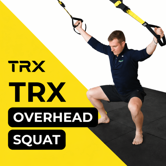 The TRX Overhead Squat is a suspension training exercise where you hold the TRX straps overhead and perform a squat, improving strength, mobility, balance, and core stability.